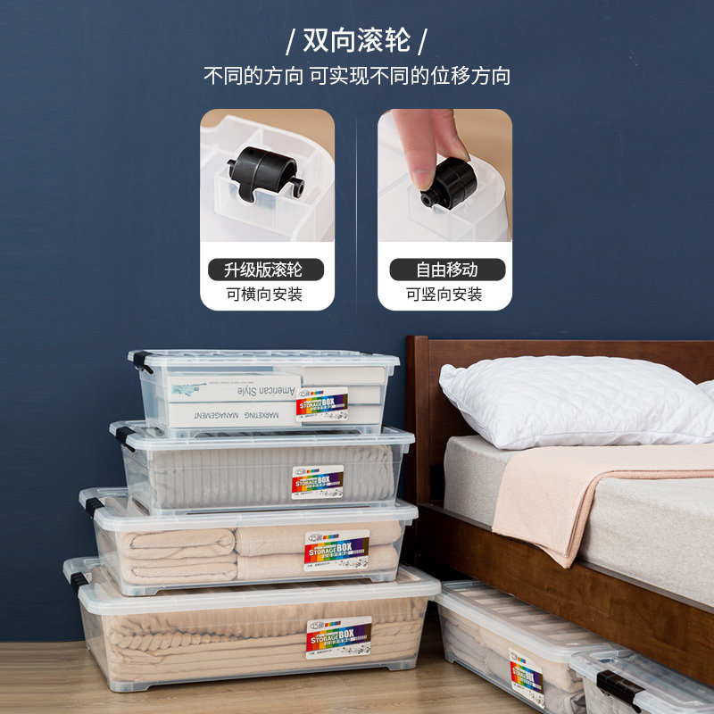 ベッド 下 収納に最適な薄型設計の衣装ケースです。 中身が見える透明ボディで、収納物を一目で確認できるため探し物の手間が省けます。 便利なキャスター付きで出し入れがスムーズに行え、ロック機能付き蓋でホコリからしっかりガードします。 積み重ねが可能なので空間を有効活用でき、季節ごとの衣類や小物類の整理整頓に大変便利です。 複数サイズ展開で用途に合わせてお選びいただけます。